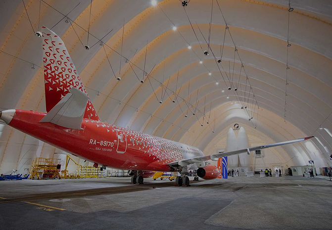 The Angarstroy company is a developer and manufacturer of inflatable pneumatic hangars for the aviation industry, including for storing airplanes and helicopters. Our products are able to work in any climatic conditions, while they remain as cost-effective as possible, do not require regular maintenance, and are built faster than in one day.