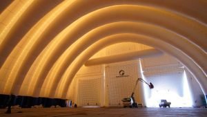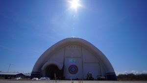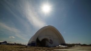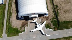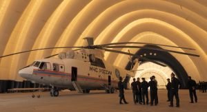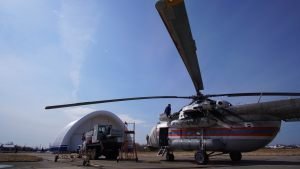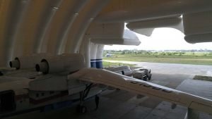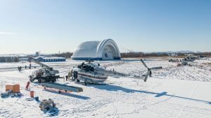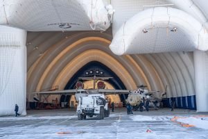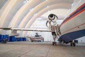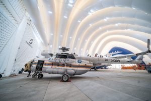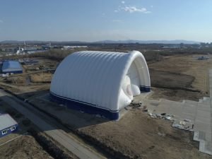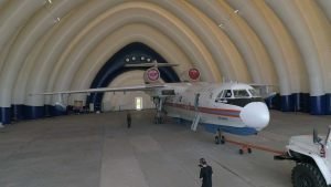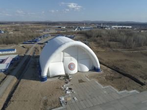 In April 2020, a pneumohangar was installed for the Aviation Rescue Centre of EMERCOM of Russia at the Khabarovsk Tsentralny airdrome. Before assembling the hanger, the Client had to maintain and repair Mi-8, Mi-26 helicopters and An-74, Be-200ChS airplanes on the open air. Low temperatures and strong wind made the technicians’ work hard, that’s why it was needed to create a reliable shelter, which could accommodate different types of air vehicles, as soon as possible. The solution was a mobile aviation hangar with internal dimensions 40х45 meters and 22 meters high completed with 37 m wide and 13 m high pneumatic gates, heating system, light system, and fire alarm system.