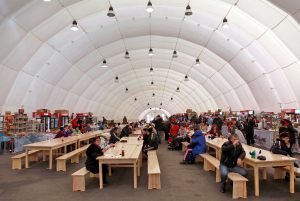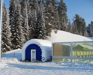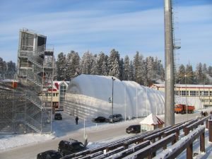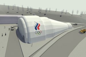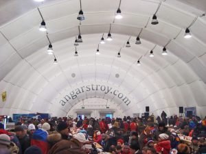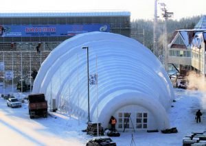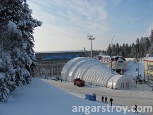 An inflatable pavilion for spectators with a useful area of 712 square meters was made for the Winter Sports Center named after Filipenko in January 2011. The design of the pneumatic construction, so called shell, was carried out jointly with the architects of Khanty-Mansiysk. During the World Biathlon Championships, the inflatable cafe-restaurant simultaneously hosted over 600 visitors. A projector was installed inside, so that spectators were aware of events going on the tracks and the stadium. The pneumo-framed pavilion is located behind the northern rostrum, not far from the conference hall building. The hangar was assembled by 8 people during 2 work shifts.