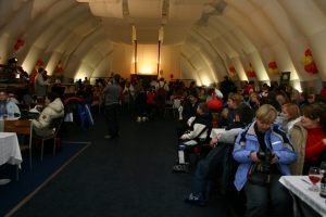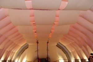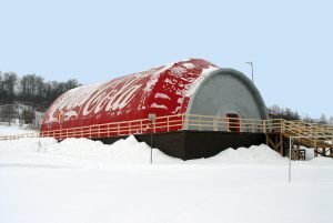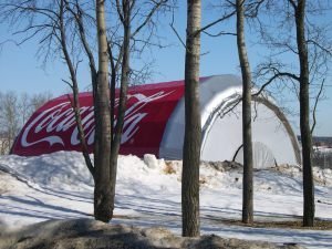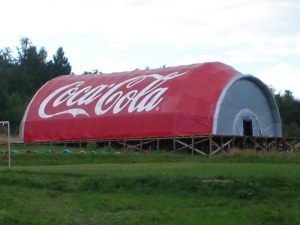 In 2005, on the territory of the ski complex Park Yakhroma in the Moscow suburbs, it was decided to develop a summer program. It is no secret that all ski resorts suffer from a lack of customers in the summer. They have chosen in Yakhroma Park to attract mass events, large companies to the territory and organize all related services for servicing these events. One of the difficulties was the organization of a year-round catering platform. In the chosen location, the construction of a monolithic, fundamental structure was not allowed. After conducting an in-depth analysis of the market for lightweight constructions, the customer concluded that the most acceptable option was a pneumatic pavilion. Together with the Coca-Cola company, a project of a unique tent in the form of the classic Coca-Cola can has been developed.